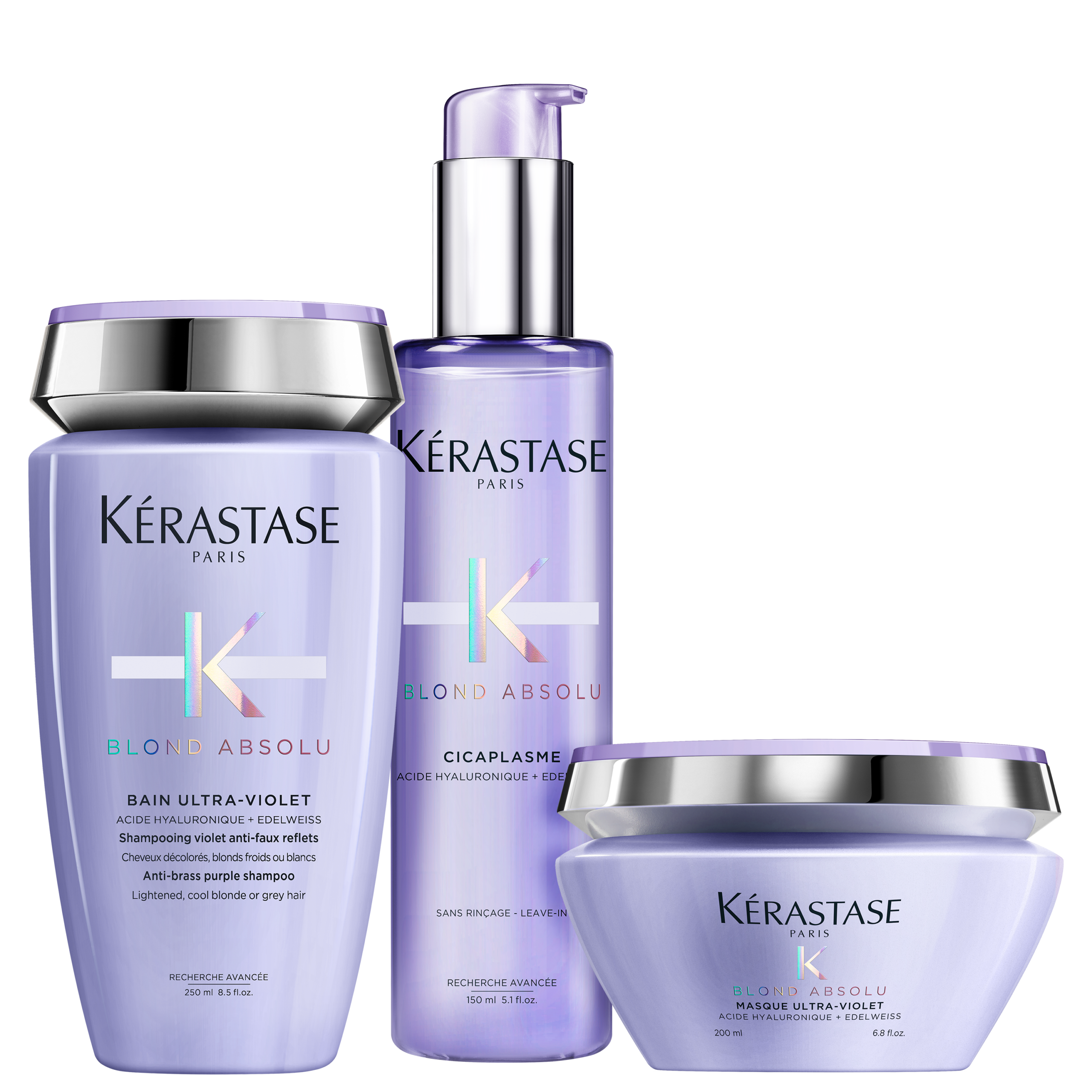 Detalhes Kit Kérastase Blond Absolu Loiro Platinado (3 Produtos) Ritual de cuidados especial para loiros super claros ou platinados. Kit Kérastase Blond Absolu Loiro Platinado neutraliza reflexos amarelados e tratam. Proporciona a cor perfeita enquanto mantém a fibra totalmente saudável, para aqueles que decidem ousar em um loiro sem limites. Kit Kérastase Blond Absolu Loiro Platinado conta com bain e máscara desamareladores, para eliminar qualquer tom quente indesejado que pode surgir com o tempo. Além disso, fortalece a estrutura interna dos fios, para tratar qualquer porosidade ou fragilidade. Garante um cabelo brilhante, no tom desejado, macio e cheio de vida. Contém Kérastase Blond Absolu Bain Ultra-Violet – Shampoo Desamarelador 250ml: elimina os reflexos quentes indesejados que podem surgir com o tempo, enquanto fortalece a fibra e protege contra a oxidação e poluição. Kérastase Blond Absolu Ultra-Violet – Máscara Desamareladora 200ml: seus pigmentos ultravioletas neutralizam instantaneamente amarelados indesejados e iluminam. Sua fórmula restauradora também traz mais força e preenche possíveis áreas porosas. Kérastase Blond Absolu Cicaplasme – Sérum Capilar 150ml: protege dos danos causados por ferramentas térmicas, reforça a ligação de fios danificados e repara pontas duplas.