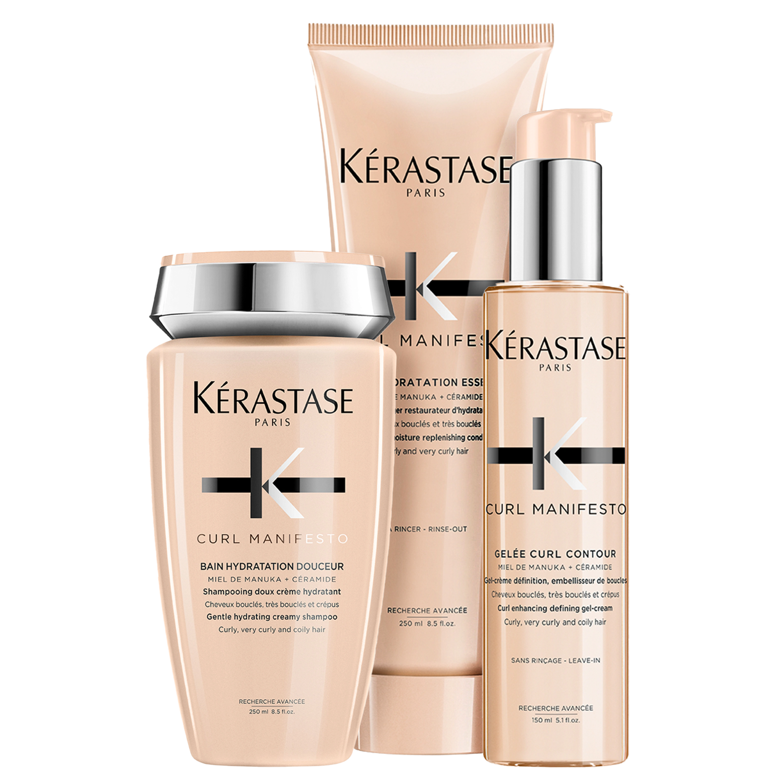Detalhes Kit Kérastase Curl Manifesto Gelée (3 Produtos) Kit com shampoo, condicionador e gel modelador para cabelos ondulados, cacheados e crespos. Kérastase Curl Manifesto Gelée traz hidratação e definição para os fios da lavagem à finalização. O Kit Kérastase Curl Manifesto Gelée garante cachos definidos com alta fixação, sem perder a umectação ideal. Conquiste um visual saudável, brilhante e incrível diariamente e em poucos passos. Contém: Kérastase Curl Manifesto Bain Nourrissant – Shampoo 250ml: limpa suavemente, sem remover a hidratação natural. Kérastase Curl Manifesto Fondant Hydratation Essentielle – Condicionador 250ml: hidrata os fios para mais definição da curvatura. Kérastase Curl Manifesto Gelee Curl Contour – Gel 150ml: hidrata suavemente e confere fixação aos fios.