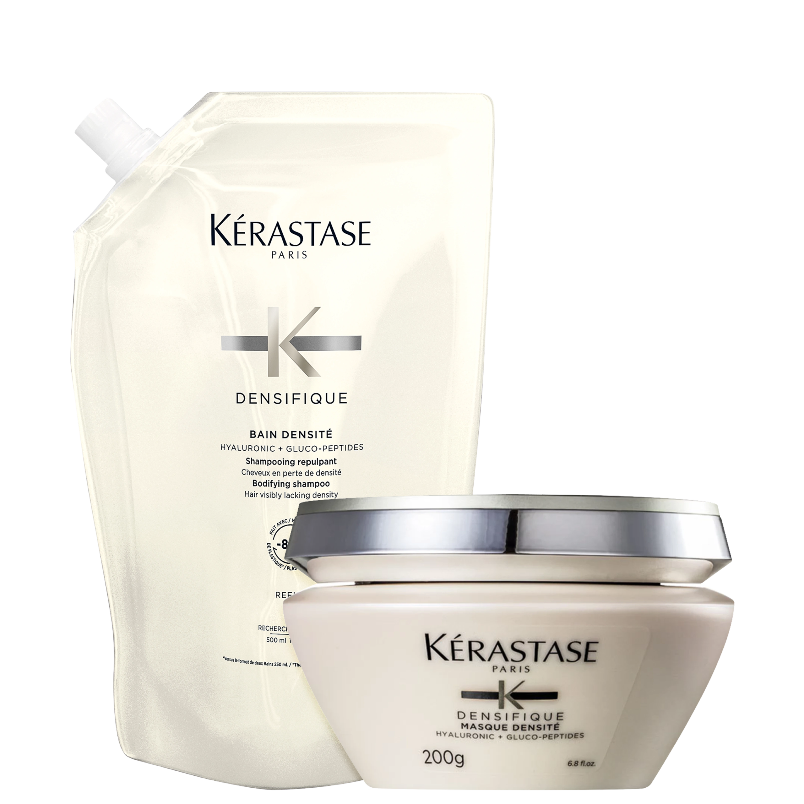 Detalhes Kit Kérastase Densifique Densité Deux Refil (2 Produtos) Kit com shampoo refil, tamanho profissional, e máscara de manutenção da densidade capilar para cabelos ralos ou com afinamento. Kérastase Densifique Densité Deux Refil estimula os fios para que consigam manter seu crescimento saudável, além de fortalecer e encorpar. O Kit Kérastase Densifique Densité Deux Refil trata a estrutura das fibras e proporciona uma aparência de fios mais espessos para que cresçam de maneira saudável e com resistência. Proporciona ainda, brilho e maciez, mantendo o balanço natural e bonito do cabelo.