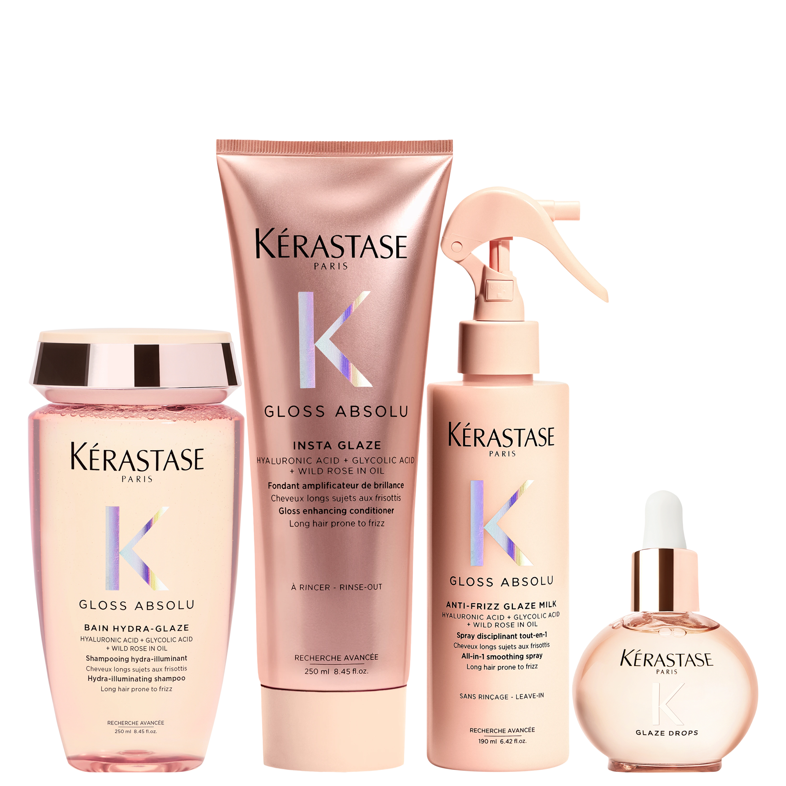 Detalhes Kit Kérastase Gloss Absolu Squad (4 Produtos) Kit com shampoo, condicionador, leave-in e óleo capilar. Kérastase Gloss Absolu Squad proporciona um tratamento antifrizz com